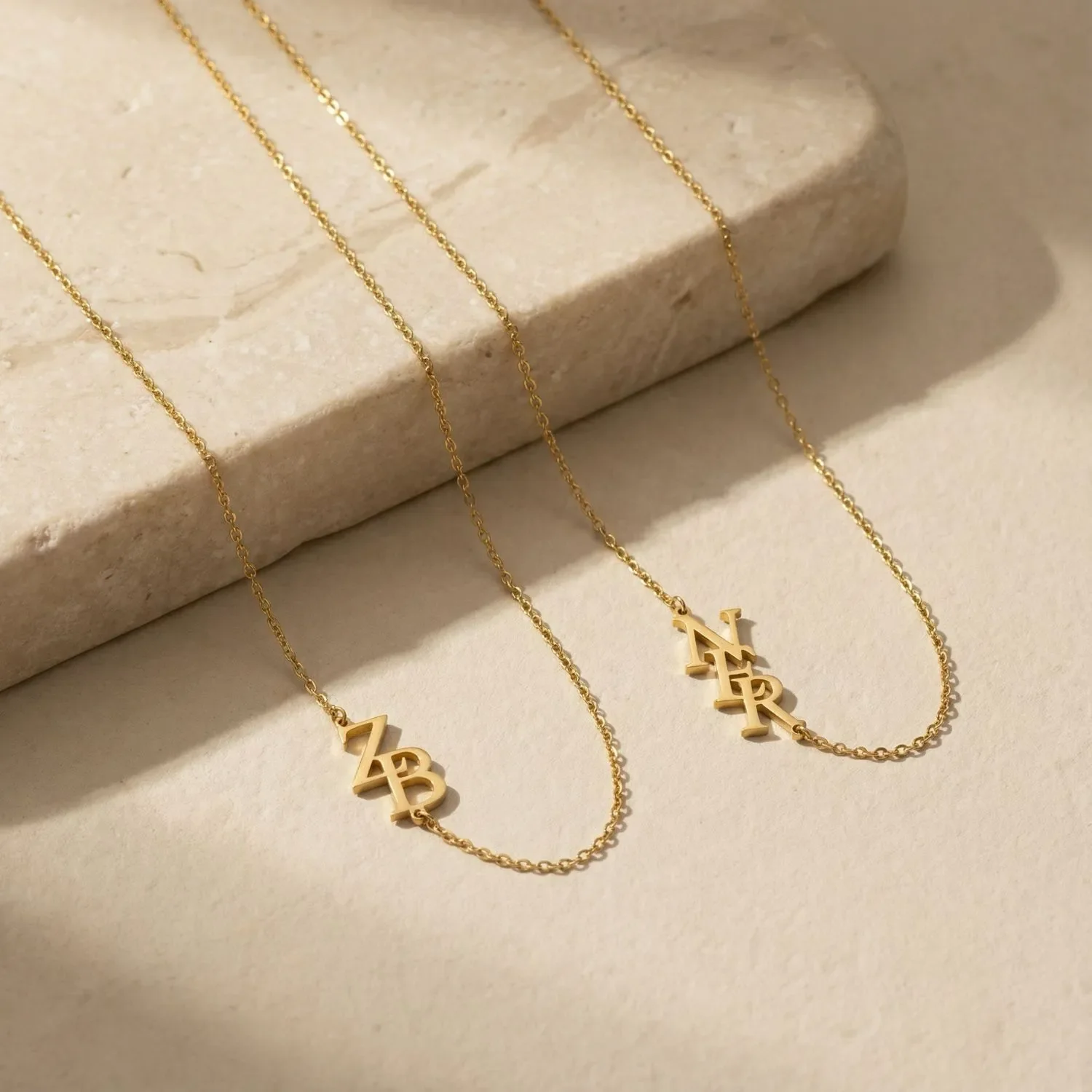 AVELIN – a stylish sideways necklace personalized with 2 or 3 initials of your choice. Think of your own letters, those of your partner, your children, or your family. Sleek and timeless, easy to match and perfect for everyday wear.